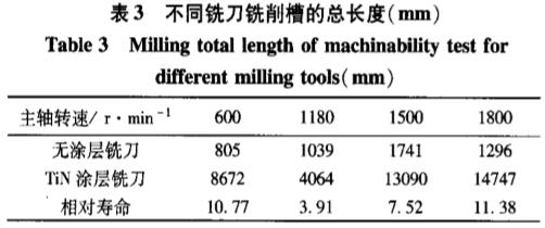 試驗(yàn)機(jī)床型號(hào)為XK5032數(shù)控立銑升降臺(tái)銑床,GSK CNC Series990M控制系統(tǒng)。切削主軸轉(zhuǎn)速分別為600r/min、1180r/min、1500r/min和1800r/min,進(jìn)給量為0.13mm/r,銑削深度為2mm,切削方式為干切削。被加工材料為40Cr鋼,經(jīng)調(diào)質(zhì)處理后硬度為36~40HRC。試驗(yàn)在被加工材料實(shí)體上銑削凹槽。在4種切削主軸轉(zhuǎn)速的試驗(yàn)方案中,當(dāng)無涂層銑刀發(fā)出劇烈尖叫聲時(shí),停止切削,檢驗(yàn)發(fā)現(xiàn)4條側(cè)刃后刀面磨損帶VB≥0.5 mm(測(cè)量位置距離刃尖1mm),切削刃口已經(jīng)磨鈍或崩刃,因此認(rèn)為無涂層銑刀已經(jīng)達(dá)到刀具壽命的極限。而有TiN涂層銑刀切削聲音相對(duì)較小,且側(cè)刃后刀面磨損帶仍較小,VB=0.2~0.3mm,還可以繼續(xù)正常切削加工。由表3現(xiàn)場(chǎng)試驗(yàn)結(jié)果可以看出,有TiN涂層銑刀的壽命大約是無涂層銑刀的3~11倍。涂層硬質(zhì)合金銑刀要在適當(dāng)?shù)那邢魉俣戎胁拍芨冒l(fā)揮刀具的使用壽命,其機(jī)理有待進(jìn)一步探索。