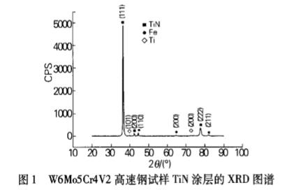 真空鍍膜PVD沉積設(shè)備配置3個(gè)陰極靶,帶有可移動(dòng)電子分離屏的電子和氬離子刻蝕系統(tǒng)。鍍膜時(shí)先抽真空至0.005~0.010Pa本底真空度并對(duì)工件進(jìn)行預(yù)熱,隨后進(jìn)行Ar離子清洗和金屬離子清洗;然后通入0.1~0.5Pa的N2,在50~80A的弧流與150-300V的負(fù)偏壓下沉積45min,沉積溫度為450~460℃。工藝參數(shù)的設(shè)計(jì)與調(diào)整,應(yīng)以獲得最佳的涂層結(jié)構(gòu)和性能為依據(jù)。通常高負(fù)偏壓和低氣體壓力,可產(chǎn)生致密平整的纖維狀組織,涂層強(qiáng)度、硬度高;而低負(fù)偏壓和高氣體壓力會(huì)導(dǎo)致較粗大的錐狀形態(tài)的柱狀晶,組織較為疏松,強(qiáng)韌性低。但負(fù)偏壓過高,產(chǎn)生過度的濺射,又會(huì)降低沉積速率。基材預(yù)熱溫度對(duì)涂層內(nèi)應(yīng)力有影響,而鍍膜溫度除對(duì)基材的強(qiáng)度、硬度有影響外,對(duì)膜/基結(jié)合力的影響尤甚,較高的鍍膜溫度有利于膜/基結(jié)合力的提高。對(duì)同爐沉積的TiN涂層試樣進(jìn)行膜層硬度測(cè)試、X射線衍射分析和掃描電子顯微鏡觀察與分析。試驗(yàn)設(shè)備分別為L(zhǎng)eica MeF3型高分辨金相顯微鏡、MICRO—DUROMAT4000型顯微硬度計(jì)(施加載荷為0.25N,保荷時(shí)間為15s)、Y-4Q型x射線衍射儀和Philips公司XL-30FEG型掃描電子顯微鏡,同時(shí)采用WS-92涂層附著力劃痕試驗(yàn)機(jī)測(cè)試涂層膜/基結(jié)合強(qiáng)度。并對(duì)涂層刀具與無涂層刀具進(jìn)行了現(xiàn)場(chǎng)切削對(duì)比試驗(yàn)。