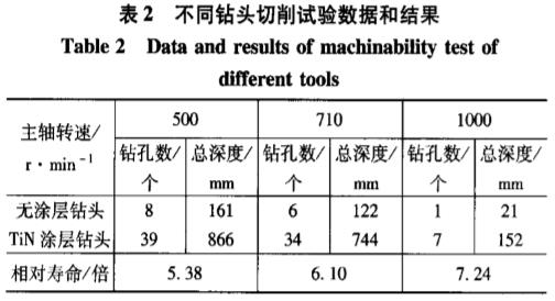 試驗(yàn)機(jī)床為Z5140A立式鉆床,切削主軸轉(zhuǎn)速分別為500r/min、710r/min和1000r/min,進(jìn)給量為0.112mm/r,鉆孔深度為22mm,切削方式為干切削。被加工材料為40Cr鋼,經(jīng)調(diào)質(zhì)處理后硬度為36-40HRC。在試驗(yàn)過程中,當(dāng)鉆頭發(fā)出劇烈尖叫聲或異常震動(dòng)等不能正常切削的現(xiàn)象時(shí),立即停止試驗(yàn)。當(dāng)切削主軸轉(zhuǎn)速為500r/min時(shí),無涂層鉆頭和有TiN涂層鉆頭都能夠平穩(wěn)地進(jìn)行切削,且切削聲音較小,有TiN涂層鉆頭的壽命約是無涂層鉆頭的5倍以上;當(dāng)主軸轉(zhuǎn)速為710r/min時(shí),無涂層鉆頭已不能穩(wěn)定地切削,且切削聲音大;有TiN涂層鉆頭則能平穩(wěn)地進(jìn)行切削,且切削聲音相對(duì)較小,有TiN涂層鉆頭的壽命大約是無涂層鉆頭的6倍以上。當(dāng)主軸轉(zhuǎn)速為1000r/min時(shí),無涂層鉆頭在剛開始鉆孑L時(shí)就發(fā)出較大的尖叫聲,第一孔還沒鉆完,鉆頭已經(jīng)發(fā)紅,發(fā)生了嚴(yán)重的燒損;有TiN涂層鉆頭卻能相對(duì)平穩(wěn)地進(jìn)行切削,但切削聲音也很大,壽命大約是無涂層鉆頭的7倍以上。切削試驗(yàn)數(shù)據(jù)和結(jié)果如表2所示。由表2的試驗(yàn)數(shù)據(jù)可知,隨著切削速度的提高,涂層鉆頭相對(duì)無涂層鉆頭的優(yōu)勢(shì)更加明顯。有涂層高速鋼鉆頭可以適用于高速切削加工,壽命大約是無涂層鉆頭的5~7倍。