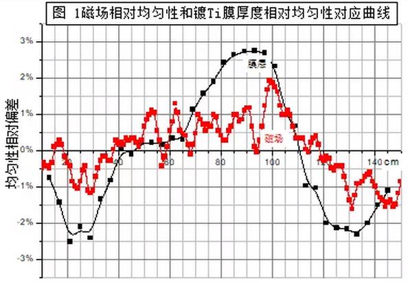 圖1中,磁場的均勻性計算方法為(Bi—Ba)/Ba,其中Bi為實際測量的靶的長度方向各點沿靶的寬度方向的磁場,Ba為實際測量的所有Bi平均;薄膜的厚度相對偏差由公式(kdi-kda)/kda計算,其中k為膜層對波長550nm的光的吸收系數,di分別為不同點的厚度,da為所有di的平均厚度。kdi由公式T=T0(1-R)exp(-kdi)計算,其中,T為樣品對波長550nm的光的透光率,T0為PET聚酯基材對波長550nm的光的透光率,R為鈦薄膜和基材接觸界面對波長550nm的光的反射率,可以認為和鈦薄膜和空氣界面的反射率相等。T、T0、R由島津的UV-3600分光光度計測量。
