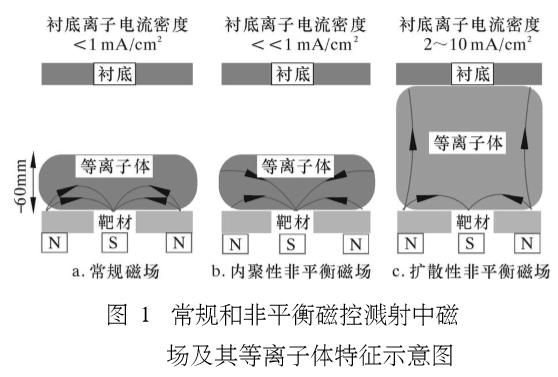 非平衡磁控濺射技術(shù)與常規(guī)磁控濺射相比,在設(shè)計(jì)上的差別很小,但是卻導(dǎo)致沉積特性的巨大差異,圖1是非平衡磁控濺射與常規(guī)磁控濺射技術(shù)的等離子體區(qū)域特征示意圖。