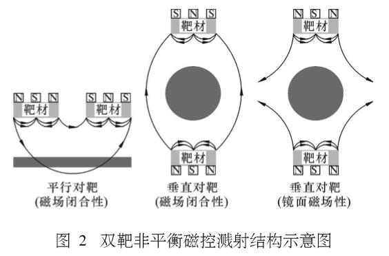 在常規(guī)磁控濺射中,等離子體被完全約束在靶材區(qū)域,典型數(shù)值大約為靶材表面6cm范圍內(nèi)。圖1c型(稱為擴(kuò)散性)的非平衡磁控濺射中,外圍磁場(chǎng)強(qiáng)度高于中心磁場(chǎng)強(qiáng)度,磁力線沒有在中心和外圍之間形成閉合回路,部分外圍的磁力線延伸到襯底表面,使得部分二次電子能夠沿著磁力線到達(dá)襯底表面,等離子體不再被限制在靶材區(qū)域,而是能夠到達(dá)襯底表面,使襯底離子束流密度提高,通常可達(dá)5mA/cm2以上。這樣濺射源同時(shí)是轟擊襯底的離子源,襯底離子束流密度與靶材電流密度成正比,靶材電流密度提高,沉積速率提高,同時(shí)襯底離子束流密度提高,從而薄膜的特性保持不變。圖1b(稱為內(nèi)聚性)為另一種非平衡磁場(chǎng),其特征為中心磁場(chǎng)強(qiáng)度比外圍高,磁力線沒有閉合但是被引向器壁,襯底表面的等離子體密度低。因?yàn)橐r底離子束流密度低,該方式很少被采用,但是有研究表明該方式能夠獲得高比表面、高活性的薄膜,得到的薄膜的孔隙度可達(dá)致密表面的1000倍以上,同時(shí)孔隙度可以控制。多孔薄膜在作為觸媒、點(diǎn)火器件、吸熱黑體等方面具有重要應(yīng)用。非平衡磁控濺射技術(shù)的進(jìn)一步發(fā)展是非平衡閉合磁場(chǎng)磁控濺射(CFUBMS),其特征為使用多個(gè)按照一定方式安裝的非平衡磁控濺射源,用于克服利用單靶在復(fù)雜襯底表面均勻沉積薄膜所面臨的巨大困難。多靶系統(tǒng)中,相鄰兩個(gè)靶的關(guān)系可以是平行放置,也可以相對(duì)放置。相鄰靶材中的磁場(chǎng)方式也有2種,如圖2所示,相鄰磁極相反時(shí),稱為閉合磁場(chǎng)方式;相鄰磁極相同時(shí),稱為鏡面磁場(chǎng)方式。在閉合磁場(chǎng)方式中,磁力線在不同靶材之間閉合,被器壁損失的電子少,襯底表面的等離子體密度高,到達(dá)襯底表面的離子與原子比是鏡面磁場(chǎng)方式或單靶非平衡磁場(chǎng)的2~3倍以上,當(dāng)襯底與靶材間距增大時(shí),閉合磁場(chǎng)對(duì)襯底表面的離子與原子比率的影響更加顯著。鏡面方式中,磁力線被引向器壁,二次電子沿著磁力線運(yùn)動(dòng)被器壁消耗,導(dǎo)致襯底表面的等離子體密度降低。