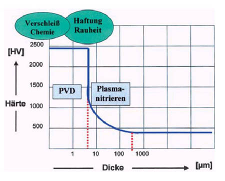 有了這些背景知識,就不必感到吃驚:只有幾個微米的硬質層在抗磨料磨損方面具有更好的表現。在極大機械應力的情況下,離子氮化和硬質涂層的組合處理便表現出極大的優勢,因為表面充分硬化的材料可能發生塑性變形,并可能壓入基層材料。離子氮化和涂層工藝為工件抗裂縫磨損能力的改善及獲得具有核心韌性的硬質表面創造了條件。圖1中的圖表所示是硬度的典型變化曲線。工件韌性通過硬化工藝獲得,在進行氮化處理后硬度增加到1000HV。表面的硬度等級直接由鍍層來決定。為了有效地遏制磨損,通常采用硬質鍍層,因為它們的硬度通常比典型硬質顆粒的硬度大。