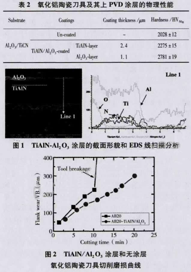 表2列出了無涂層和TiAlN/Al2O3涂層的硬度表征結(jié)果,可見PVD法沉積的硬質(zhì)涂層可顯著提高氧化鋁刀具硬度,作為硬質(zhì)、耐磨中間層的TiAlN涂層可將刀具表面硬度提高40%,從而有效增加刀具耐磨性。而充當(dāng)TiAlN耐磨層化學(xué)屏障角色的Al2O3涂層,其硬度也比氧化鋁基體高10%左右。涂層的顯微硬度與涂層材質(zhì)和微觀結(jié)構(gòu)有關(guān),同等材質(zhì)下,致密細(xì)晶結(jié)構(gòu)的硬度更高。
