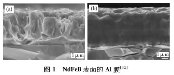 MaoSD等采用直流磁控濺射技術(shù)在NdFeB上沉積Al膜,得到呈柱狀晶結(jié)構(gòu)的Al薄膜,如圖1(a)所示。研究表明,磁控濺射鍍鋁提高了磁體的耐腐蝕性能;由于鍍鋁層柱狀晶間的微孔貫穿薄膜,因此帶有Al防護(hù)鍍層的NdFeB材料腐蝕時(shí),腐蝕液會(huì)通過(guò)這些微孔到達(dá)基體。MaoSD等又采用了離子束輔助磁控濺射(Ion-beam-assisteddeposition,IBAD)的方法在NdFeB表面制備了Al膜,見(jiàn)圖1(b),可以看出柱狀晶結(jié)構(gòu)消失,膜層更加均勻和致密,結(jié)果表明,經(jīng)240h中性鹽霧試驗(yàn)后,磁控濺射的純Al薄膜表面出現(xiàn)大面積的紅銹,但I(xiàn)BAD制備的Al膜表面只有少量的紅銹,其耐蝕性能明顯提高,這主要是由于IBAD-Al膜層中存在更多致密的氧化膜。MaoSD等也采用等離子體輔助磁控濺射法制備了Al/Al2O3多層膜。