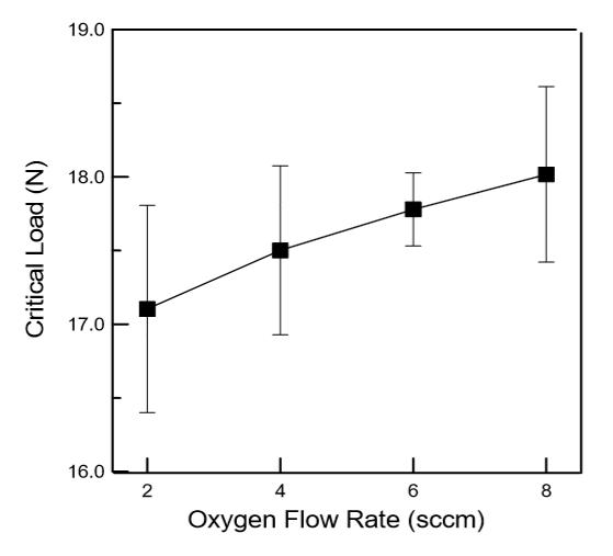 實驗發現薄膜之附著性質主要受到其微結構和薄膜內殘留應力所支配。由刮痕試驗中,發現鍍層破壞型態為一同形的半圓形裂痕軌跡(conformal cracking),為一張應力破壞模式產生。實驗中藉由氧氣流量增加,氧空位減少,避免晶格失序(disorder)或扭曲的現象,減少薄膜內殘留之張應力以及在高氧流量有較低之濺鍍速率可增加粒子轟擊(peening)效果,故有較佳之附著性質且隨著膜厚的增加,其附著性質亦隨之減少。