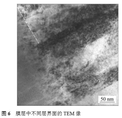 圖5所示為較高分辨率下CrN層與CrTiAlN層之間界面的TEM像(白線處)。由圖可知:界面不明顯,反映出層間的良好結合,由于CrN與CrTiAlN的柱狀晶是錯開一定角度生長的,這對提高膜層的抗氧化性及耐腐蝕性起到很好的作用。