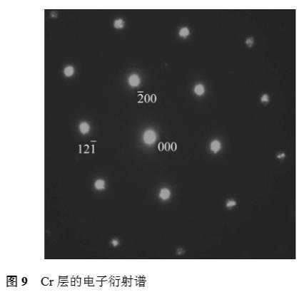 圖9所示為Cr層的電子衍射圖。圖中,(000)為中心透射斑,其到)002(衍射斑的距離經測量均為27.0mm,而由上已知Lλ=39.369mm·Å。根據公式Lλ=Rd,可求得(200)的面間距d=1.458Å,另外,(000)到)112(的距離經測量為33.0mm,同樣地,可求得)112(的面間距d=1.193Å。與標準卡片值1.442Å和1.117Å相比,可知所測得的數據與標準卡片值相吻合。