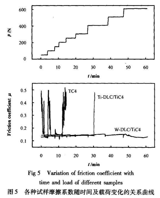 c、摻雜w元素的W-DLC/TC4薄膜由于在薄膜中形成WC微晶,有利于提高膜層的耐磨性及其硬度和膜/基結(jié)合強度,具有更高的承載能力及更優(yōu)異的抗磨性能,更適合于易磨損器件的表面改性。