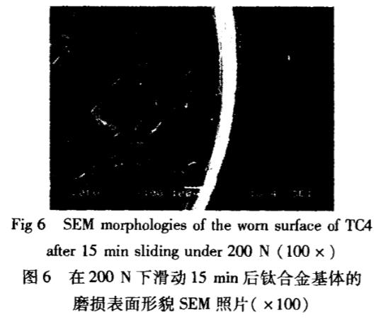 圖6所示為TC4基底在漸進加載(漸進方式如圖5上半部)至200N保載滑行15min后(不能繼續(xù)試驗)的磨損表面局部形貌SEM照片可見:其磨痕表面粘著痕跡明顯,主要為粘著磨損,并伴有少量磨粒磨損且磨痕較深,這主要是由于在加載初期,TC4表面氧化生成脆性較大的氧化鈦膜,在摩擦過程中出現(xiàn)疲勞裂紋,裂紋隨摩擦的繼續(xù)而擴張,隨著顆粒剝落形成磨粒而導致磨粒磨損¨.加載至200N并保載滑行15min后,由于基體較軟,承載能力不足而與偶件粘著,由于以粘著磨損為主,且伴有少量的磨粒磨損,故其的磨損率和摩擦系數(shù)較高。