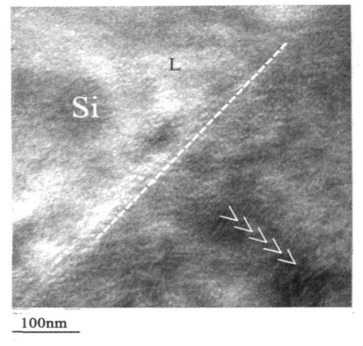 圖3是基體(Si)與膜層之間界面。由圖可見:左上角為(100)單晶Si基體,其晶格像明顯,而且對右下角的過渡層(主要為TiN)晶體顆粒的取向有一定的導向作用;其界面也可分辨且結合良好。