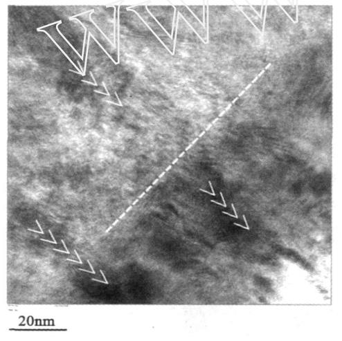 圖4是過渡層中的不同層界面。由圖可見:其界面不明顯,結合非常良好;晶體顆粒都是沿一個方向生長,但在界面處是錯開一定角度生長的。