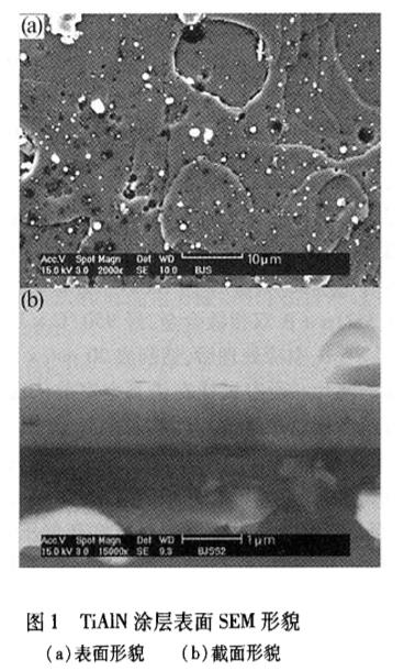 由圖1a電弧離子鍍制備的TiAIN涂層表面SEM形貌可見,涂層較平整,有白亮的液滴存在,能譜分析其主要化學成分為Ti、Al及少量的N。膜層中Ti/Al原子比值為1.157,沉積的涂層中化學元素成分出現成分偏析現象,涂層中Al的含量低于合金靶的設計成分。一般認為,成分偏析現象是由于合金各組元的電離度差異所造成的,飽和蒸汽壓低而熔點高的元素其離化率也高4,通常T的起弧電流為70A,而AI的起弧電流為50A,本次試驗中TiAl合金靶材弧流為70A,大于Al的起弧電流。由于Al的熔點較T低且蒸氣壓高,陰極靶中AI的蒸發加快,金屬等離子體增加,但對膜層自身的濺射作用也相應加大,AI的損失量要大于Ti的。Thonton結構區域模型提出氣相沉積薄膜的結構取決于基體溫度T與膜材熔點T之比及鍍膜時的氣體壓力。假定鍍膜時基體溫度為450℃,T/T Al=0.77,膜層結構位于密排顯微晶粒組成的過渡區域;T/T Ti=0.37則對應致密柱狀晶結構區間。對于合金TiAl靶,Ti、Al共同沉積時,存在T/T Al>T/T Ti,Al先蒸發隨后伴隨著Ti的蒸發耗盡,其膜層結構應為過渡區和致密柱狀晶的混合結構,從圖1b涂層截面SEM形貌也可以看出膜的結構致密,無粗大柱狀晶出現。
