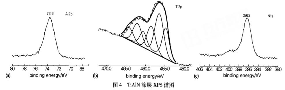 圖4為TiAlN涂層XPS譜線。由圖4a可見TiAlN涂層的Al2p峰形較整齊,沒有出現明顯的裂化現象。金屬Al的標準2p軌道電子結合能為72.9eV,當它進入TiN的晶胞形成TiAlN后相對應的AI2p軌道電子結合能變為73.6ev,其值明顯不同于標準AlN的74.4eV,這也證實在氮化反應過程中沒有生成六方結構的AlN相,此結論與圖3中TiAlN層的XRD衍射結論一致。金屬Al參與反應生成TiAIN出現了明顯的化學移位現象,一方面與Al向N原子輸送電荷有關,另一方面Ti原子也會影響Al原子的電子狀態,從而影響了AI和N原子周圍的電子云密度。由圖4b所示的TiAIN涂層Ti2p譜可見,無論是Ti2p3/2峰還是Ti2p1/2峰,峰形都不對稱且峰寬較大,這表明膜層中Ti的化學態不止一種,涂層的Ti2p峰可分解為3個峰,分別對應著AIN(454.8eV)、Ti-O-N(454.7eV)和TiO2(458.5eV),室溫下TiAIN的涂層表面存在輕微氧化現象。由圖4c可以看出,N1s具有雙峰結構,主峰對應的結合能為396.3eV,另一弱峰值約為400eV,其主特征峰位偏離TiN中N1s峰位396.9eV,向低能端移動。由XRD分析知,氮化物涂層中主要以(Ti,Al)N相的形式存在,相結構同TiN一致,均為NaCl晶型,,Al原子可以固溶在TiN中,Al原子的引入,打破了原Ti-N鍵引起了TiAIN中N1s峰位的偏移。