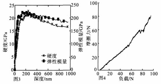 摻鎢DLC膜的納米壓痕實驗結果如圖3所示。從圖3可以看出,當壓入深度為時,壓入深度對硬度和彈性模量的影響較小,摻鎢DLC膜的硬度和彈性模量分別為和200~228GPa。摻鎢DLC膜的劃痕實驗結果如圖4所示,從圖4可以看出,本研究采用的摻鎢DLC膜的摩擦力-載荷關系曲線存在兩個突變點,第一個突變點在55N左右,第二個突變點在左右,利用體視顯微鏡觀察劃痕形貌發現第一個突變點對應于DLC膜內部不同亞層之間的剝離,第二個突變點對應于DLC膜的小面積剝落,可以斷定劃痕實驗臨界載荷為75N,DLC膜具有好的膜/基結合力。