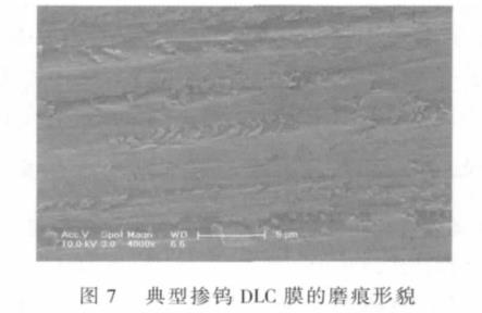 典型的DLC膜磨損形貌如圖7所示,從圖7可以看出,磨痕表面存在明顯的犁溝和膜層內部的微觀斷裂。犁溝主要是由于基體硬度低,在磨損過程中DLC膜底部的不銹鋼基體在對摩副壓入時發生塑性變形引起的;在基體發生塑性變形時,變形區域上的DLC膜產生斷裂和剝離現象,能譜分析發現犁溝底部的化學組成主要是碳和鎢,這表明摻鎢DLC膜在磨損過程中并沒有發生直抵基體的大面積剝落現象,僅僅發生了梯度摻鎢DLC膜內部微觀斷裂和不同亞層之間的剝離。