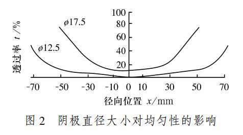 采用兩種不同直徑大小的陰極進(jìn)行實(shí)驗(yàn),它們的直徑分別為ö17.5mm和ö12.5mm,此時輔助陽極高度為30mm、內(nèi)徑為40mm、內(nèi)孔錐度45°,所得結(jié)果如圖2所示。在ö70mm范圍內(nèi),它們的透過率相對變化分別為±41.7%、。膜厚均勻性沒有明顯變化。可見陰極的尺寸雖然改變了,但它的放電面積變化并不大。要想改善膜層均勻性,必須使陰極表面均勻放電,即弧斑在陰極表面上均勻游動。