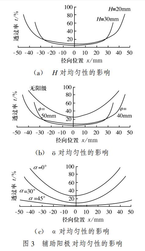 在陰極直徑為ö17.5mm,輔助陽極的基本尺寸為高度30mm、內(nèi)徑40mm、內(nèi)孔錐度45°的情況下,分別改變輔助陽極高度H、內(nèi)徑ö、內(nèi)孔錐度α進(jìn)行鍍制實(shí)驗(yàn)。從圖3可見,輔助陽極對鍍膜均勻性有影響,但無論采用那種情況所鍍制的膜層,它們的透過率相對變化在ö60mm范圍內(nèi)都已超過±10%。