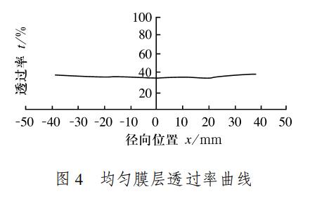 實(shí)驗(yàn)在各工藝參數(shù)即主回路電壓、起弧回路的電壓和電容、頻率和真空度不變的條件下,改變脈沖真空電弧離子源電極幾何尺寸,主要通過改變陰極(起弧極與陰極是配套的)和輔助陽極的幾何尺寸來研究對膜厚均勻性的影響。這里用膜層透過率的相對變化來表征膜厚均勻性,其具體的計算公式為