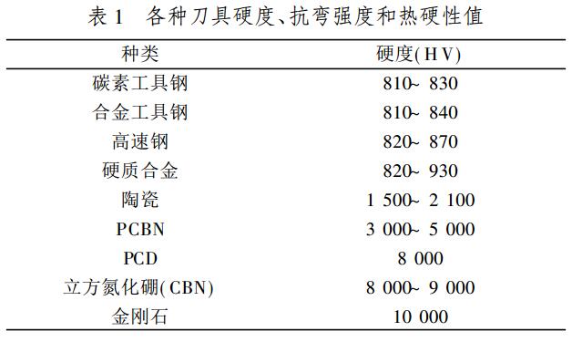 金剛石刀具具有硬度高、抗壓強(qiáng)度高、導(dǎo)熱性好和耐磨性好等特性,可在高速切削中獲得很高的加工精度和加工效率。由于聚晶金剛石(PCD)的結(jié)構(gòu)是取向不一的細(xì)晶粒金剛石燒結(jié)體,雖然加入了結(jié)合劑,其硬度及耐磨性仍低于單晶金剛石。表1給出了各種刀具的硬度值,PCD的硬度可達(dá)8000HV,為硬質(zhì)合金的8~12倍;CBN晶體結(jié)構(gòu)與金剛石類似,因此具有與金剛石相近的硬度和強(qiáng)度;CBN微粉的顯微硬度為8000~9000HV,其燒結(jié)體PCBN的硬度一般為3000~5000HV。