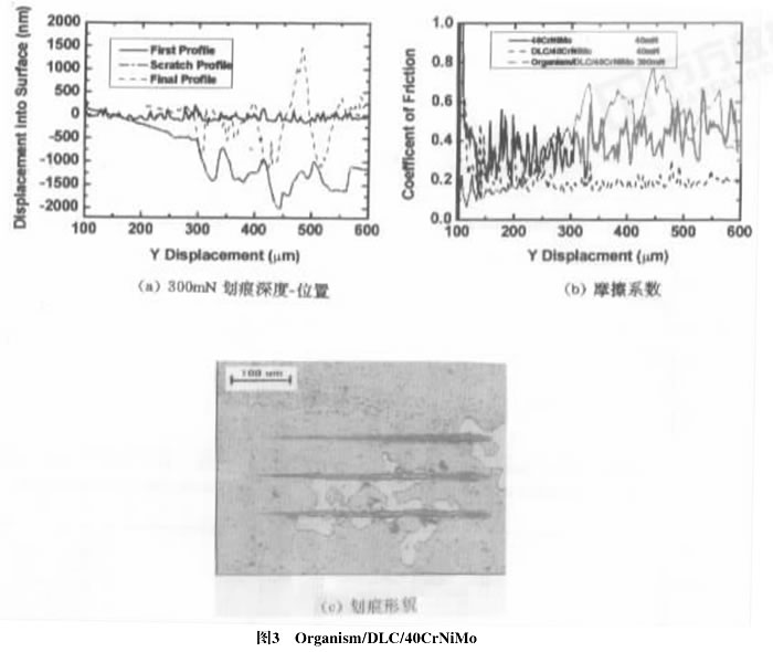 在圖4a中,9Cr18和DLC/9Cr18的摩擦系數(最大法向載荷為40mN)約分別為0.35和0.2,Organism/DLC/9Cr18的摩擦系數(最大法向載荷為100mN,對應圖4b中下面第二條劃痕)為0.15,固體潤滑效果明顯,當最大法向載荷為300mN時,Organism/DLC/9Cr18在100um~200um范圍內的摩擦系數較穩定,約為0.15,說明壓針在Organism/DLC中刻劃,隨后,摩擦系數逐漸變大,說明壓針劃到基體,摩擦系數最終接近基體的摩擦系數,對應圖4b中上面第三條劃痕,從劃痕顯微照片和摩擦曲線對比發現,摩擦系數開始變大對應于殘余劃痕的起點,說明壓針劃入軟基體,有殘余劃痕存在。